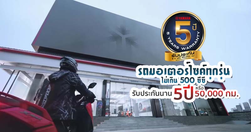 รถมอเตอร์ไซค์ยามาฮ่าทุกรุ่น (ไม่เกิน 500 ซีซี) รับประกันนาน 5 ปี หรือ 50,000 กม.