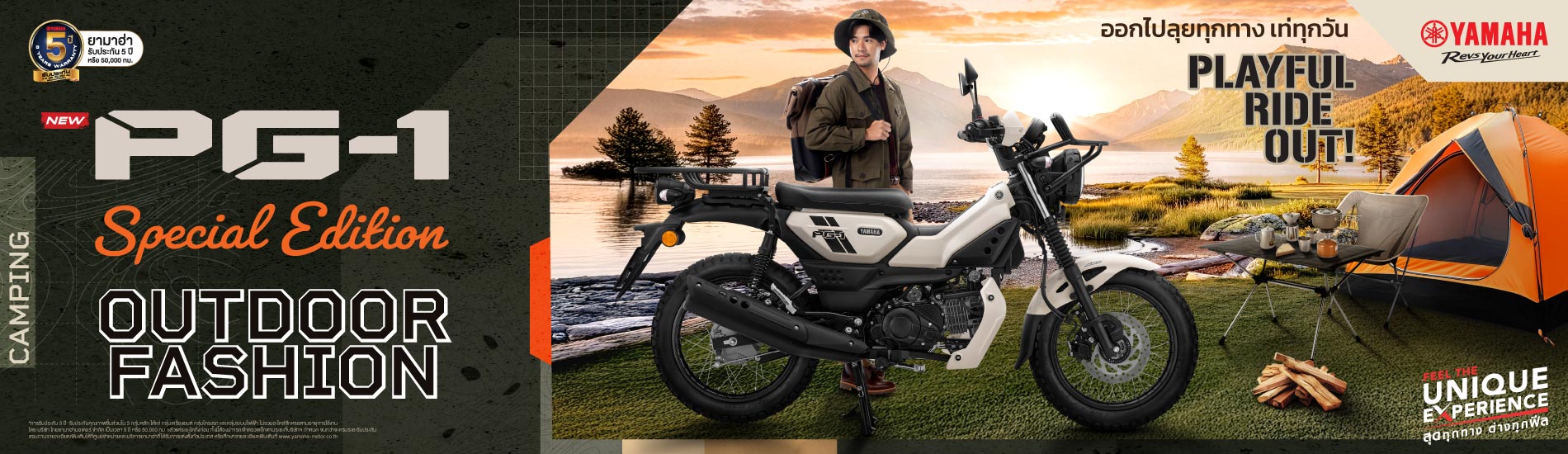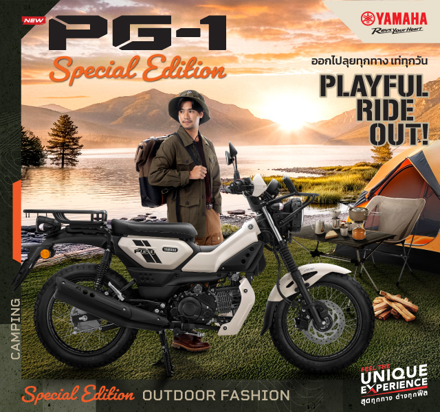 YAMAHA PG-1 SPECIAL EDITION OUTDOOR FASHION Playful Ride Out ออกไปลุยทุกทาง เท่ทุกวัน สำหรับขาลุยตัวจริง พร้อมออกไปพบสิ่งใหม่ที่ท้าทาย สาย OUTDOOR CAMPING ไม่ว่าแบบไหน พร้อมไปได้ทุกสถานการณ์ กับชุดแต่งรอบคัน ส่งคุณไปได้ทุกที่เต็มพิกัด ครบครันทั้งฟังก์ชันและดีไซน์และมั่นใจกับชุดการ์ด ให้คุณออกไปมันส์ได้ทุกเดย์ เท่ทุกทาง